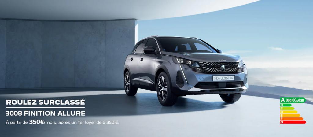 En location longue durée sur 49 mois et pour 40 000 km. Exemple pour la location longue durée (LLD) d’une Peugeot SUV 3008 Active Pack Plug-in Hybrid 180 neuve, hors options. Montants exprimés TTC et hors prestations facultatives. Offre valable du 01/03/2023 au 31/03/2023, réservée aux personnes physiques pour un usage privé pour toute LLD d’une Peugeot 3008 hybrid neuve dans le réseau Peugeot participant, sous réserve d’acceptation du dossier par CREDIPAR, loueur et SA au capital de 138.517.008 €, RCS Versailles n° 317 425 981, ORIAS 07004921 (www.orias.fr), 2-10 boulevard de l’Europe 78300 Poissy. Offre non valable pour les véhicules sur le site store.peugeot.fr.