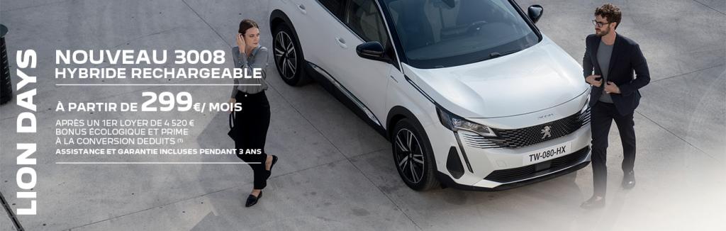 (2) Soit une reprise de 6 000€ de votre véhicule éligible à la prime à la conversion. Offre non cumulable avec l'estimation indicative de votre véhicule effectuée sur le site Reprise Peugeot. Le véhicule repris doit être d’une puissance réelle inférieure ou égale à celle du véhicule neuf acheté. Offre réservée aux particuliers, incluant la prime à la conversion en vigueur selon éligibilité, valable du 01/03/2021 au 30/04/2021 pour toute commande d’un Nouveau 3008 Hybride Rechargeable neuf, passée avant le 30/04/2021 et livrée avant le 30/06/2021 dans le réseau PEUGEOT participant. Offre non valable pour les véhicules au prix Peugeot Webstore et les véhicules sur le site store.peugeot.fr.