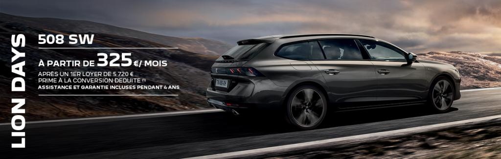 (2) Soit une reprise de 5 000€ de votre véhicule éligible à la prime à la conversion. Offre non cumulable avec l'estimation indicative de votre véhicule effectuée sur le site Reprise Peugeot. Le véhicule repris doit être d’une puissance réelle inférieure ou égale à celle du véhicule neuf acheté. Offre réservée aux particuliers, incluant la prime à la conversion en vigueur selon éligibilité, valable du 01/04/2021 au 30/04/2021 pour toute commande d’une Nouvelle 508 neuve passée avant le 30/04/2021 et livrée avant le 30/06/2021 dans le réseau PEUGEOT participant. Offre non valable pour les véhicules au prix Peugeot Webstore et les véhicules sur le site store.peugeot.fr.