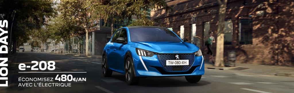 (1) * Exemples réalisés sur la base d’une location longue durée 37 mois 30.000 km pour une e-208 Style neuve, hors option, soit un 1er loyer de 9 900 € ramené à 3900 € après déduction du bonus écologique de 6 000 € et d’une 208 Style PureTech 100 S&S EAT8 hors option, soit un 1er loyer de 3 900 €. Loyers incluant la maintenance au prix de 17,50 €/mois pour 37 mois et 30 000 km pour une e-208 Style et de 23,50€ pour une 208 Style PureTech 100 S&S EAT8. Montants exprimés TTC et hors prestations facultatives. Le coût de la carte grise est celui du département 75, le coût de l’essence 1.52€/litre et celui du KWH à 0.16€. Offre non cumulable valable jusqu’au 31/10/21, réservée aux particuliers, dans le réseau Peugeot participant, et sous réserve d’acceptation par CREDIPAR, loueur et SA au capital de 138.517.008 €, RCS Versailles n° 317 425 981, ORIAS 07 004 921 (www.orias.fr), 2-10 boulevard de l’Europe 78300 Poissy. Peugeot e-208 à partir de 159 €/mois, après un 1er loyer de 3 130 €. Déduction faite du bonus écologique et de la prime à la conversion (1). Assistance et garantie inclus pendant 3 ans. En location longue durée sur 37 mois et pour 30 000 km. Exemple pour la location longue durée (LLD) d’une nouvelle Peugeot e-208 Active neuve, hors options, incluant l’assistance et l’extension de garantie pendant 37 mois. Montants exprimés TTC et hors autres prestations facultatives. (1) Après déduction du bonus écologique d’un montant de 6 000 € et de la prime à la conversion gouvernementale de 2 500 € sous condition de reprise d’un véhicule diesel immatriculé avant le 01/01/2011 ou d’un véhicule essence immatriculé avant le 01/01/2006, selon décret en vigueur qui s’applique. Profitez d’un chèque recharge de 500 € TTC dans le cadre de l’acquisition d’une Peugeot e-208 dans le réseau Peugeot participant. Ce chèque recharge sera matérialisé par une remise complémentaire de 500€ TTC. Offre valable du 01/10/2021 au 31/10/2021, sous condition de reprise, réservée aux personnes physiques pour un usage privé pour toute LLD d’une nouvelle Peugeot e-208 neuve dans le réseau Peugeot participant, sous réserve d’acceptation du dossier par CREDIPAR, loueur et SA au capital de 138.517.008 €, RCS Versailles n° 317 425 981, ORIAS 07004921 (www.orias.fr), 2-10 boulevard de l’Europe 78300 Poissy. Offre non valable pour les véhicules au prix Peugeot Webstore et les véhicules sur le site store.peugeot.fr. Le Contrat de Service Pack Extension peut être souscrit indépendamment de toute LLD aux conditions disponibles dans le réseau Peugeot participant.